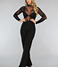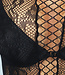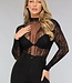 Dieser Body hat ein Fischnetzmuster und lange Ärmel. Der gesamte Body hat ein Druckmuster mit einem großen Netzbereich zwischen dem Busen. Der Body ist tailliert und schwarz. Außerdem verfügt der Body über ein Tanga-Modell. Der Body hat unten keinen Verschluss, lässt sich aber dank des Stretchanteils leicht an- und ausziehen.