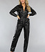 Dieser Jumpsuit ist aus einem Stoff in Lederoptik gefertigt. Der Jumpsuit hat lange Ärmel, die locker fallen. Sie können den Overall einfach mit einem Reißverschluss anziehen. In der Taille können Sie den mitgelieferten Gürtel tragen. Die Beine des Jumpsuits sind gerade und nicht eng. Auf der Brust befinden sich zwei Ziertaschen.