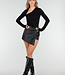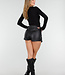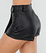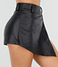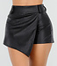 Dieser schwarze Skort ist aus geschmeidigem Lederimitat mit Stretchanteil gefertigt, das sich angenehm an den Körper anschmiegt. Der asymmetrische Überwurf vorne sorgt für eine schlanke und moderne Silhouette. Die kurze Länge verleiht einen femininen, aber dennoch coolen Look. Der Skort hat eine hochwertige Verarbeitung mit feinen Nähten und eine glatte Innenseite für hohen Tragekomfort.