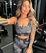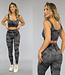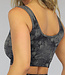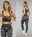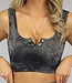 Dieses graue Sporttop ist mit einem Rippenmuster versehen. An den Schultern hat das Top zwei breite Träger. Das Top hat herausnehmbare weiche Polster und ist sehr dehnbar, so dass das Tragen eines BHs nicht notwendig ist. Auf der Vorderseite des Tops befinden sich zwei Druckknöpfe und es hat eine Marmoroptik.
