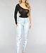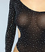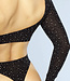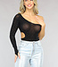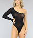 Dieser Body hat ein Netzmuster und ein One-Shoulder-Design. Der Body ist mit einem Netzmuster und Glitzersteinen versehen. Der Body ist tailliert und in schwarz gehalten. Außerdem hat der Body lange Ärmel und einen Ausschnitt auf der Rückseite. Der Body hat unten keinen Verschluss, lässt sich aber dank des Stretchanteils leicht an- und ausziehen.