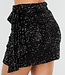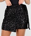 Dieser schwarze Wickelrock ist vollständig mit glänzenden Pailletten verziert, die für einen luxuriösen Glitzereffekt sorgen. Das kurze Modell wird an der Seite gebunden, wodurch das Wickeldesign schön zur Geltung kommt. Die gerade Passform verleiht dem Rock einen eleganten, festlichen Look. Eine zeitlose Wahl für jeden Party-Look.