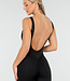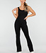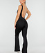 Dieser braune Jumpsuit hat eine enganliegende Passform mit weit ausgestellten Beinen. Die Träger sind breit und die Vorderseite hat einen Rundhalsausschnitt. Der Rücken ist tief bis unter die Taille ausgeschnitten und hat eine dezente Raffnaht am Gesäß. Das Modell ist ärmellos und aus einem glatten, dehnbaren Stoff gefertigt.