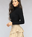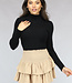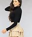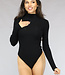 Dieser Rippenbodysuit hat lange Ärmel und einen hohen Ausschnitt mit kleinem Rollkragen. An der Brust und an der Taille befindet sich ein Rippendetail, das Ihre Taille schön betont. Das Unterteil ist mit einem Tanga-Detail versehen und hat unten einen Druckknopfverschluss, der aus zwei Druckknöpfen besteht. Der Rippenstoff verleiht dem Body ein geripptes Muster.
