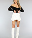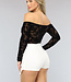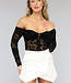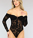 Dieser Body ist aus einem Mesh-Gewebe mit eingesetztem Velours-Paisleymuster gefertigt. Er hat einen schulterfreien Schnitt. Der Body ist bis auf die Cups durchsichtig. Die Cups sind weder gepolstert noch haben sie Bügel. Auf der ganzen Vorderseite befinden sich zwölf Haken, die man öffnen und schließen kann. Der Boden des Bodys kann mit drei Druckknöpfen geschlossen werden.
