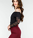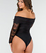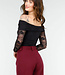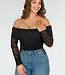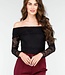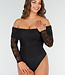 Dieser elegante, dehnbare, schwarze Off-Shoulder-Body ist aus einem weichen Stoff gefertigt und hat lange, durchsichtige Spitzenärmel, die für einen raffinierten Look sorgen. Der Body hat eine eng anliegende Passform und ist ideal für eine Vielzahl von Anlässen, von einer Party bis zu einem Abendessen. Kombinieren Sie ihn mit einem hübschen Rock oder einer Hose mit hoher Taille für ein stilvolles Outfit. Der Bodysuit hat Druckknöpfe.
