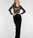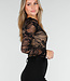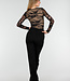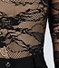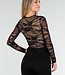 Dieser schwarze Body besteht aus feiner Spitze mit einer beigen Unterlage, die für einen dezenten Kontrast sorgt. Der Stoff ist dehnbar, sodass sich der Body gut an den Körper anschmiegt. Die Oberschicht besteht aus schwarzer Spitze mit Blumenmuster, das sich über die langen Ärmel fortsetzt. Der Ausschnitt ist rund und mit einer schmalen Paspel verziert. Der untere Teil wird mit Druckknöpfen geschlossen.