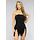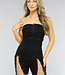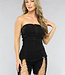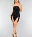 Dieser coole Jumpsuit hat einen trägerlosen Schnitt und ist schwarz. Auf der Rückseite hat er einen Reißverschluss, so dass man leicht hineinkommt. Rund um das Oberteil befinden sich fünf Schlaufen und ein Druckknopf, die dem Overall einen Jeans-Look verleihen. Als zusätzliches Detail hat dieser Playsuit offene Beine mit einem Kettendetail. Dank des Stretch-Stoffes ist dieser Playsuit herrlich bequem!