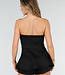 Dieser Playsuit ist aus einem schwarzen, glatten Stoff gefertigt und hat ein trägerloses Design mit geradem Ausschnitt. Das Modell hat ein eng anliegendes Oberteil und einen ausgestellten Shorts-Teil, der wie ein Rock aussieht. Der Playsuit wird mit einem verdeckten Reißverschluss an der Seite geschlossen und hat keine Ärmel. Die Konstruktion sorgt für eine enge Passform im oberen Bereich und zusätzliche Bewegungsfreiheit im unteren Bereich.