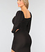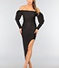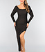 Dieses Kleid hat einen asymmetrischen Schnitt mit langen Ärmeln. Das Kleid hat einen Midi-Stil und fällt bis zur Mitte des Beins, es enthält auch einen Schlitz. Das Kleid ist elastisch und aus einem glitzernden Stoff mit viel Stretch gefertigt. Das Kleid hat einen elastischen Halsausschnitt, so dass man es auch schulterfrei tragen kann.
