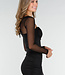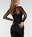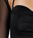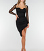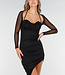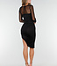 Dieses schwarze Kleid hat eine figurbetonte Passform und ist aus Stretchmaterial gefertigt. Die Cups sind mit Polstern und Neckholder-Trägern für zusätzlichen Halt und Form versehen. Das Kleid hat lange Ärmel aus transparentem Mesh und einen tiefen, geformten Ausschnitt. Der Rock ist asymmetrisch geschnitten und fällt vorne kurz und an der Seite länger. Die Falten über die gesamte Länge betonen die Silhouette.