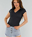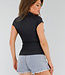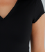 Dieses Polo ist in der Farbe Schwarz gehalten und hat eine eng anliegende, schmale Passform. Es hat einen klassischen Kragen ohne Knopfverschluss und einen V-Ausschnitt. Die Ärmel sind kurz und liegen eng am Oberarm an. Der Saum ist gerade und fällt knapp über die Hüfte. Die Rückseite ist einfarbig und hat die gleiche Form wie die Vorderseite.