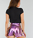 Dieses schwarze T-Shirt hat eine schmale Passform und liegt eng am Körper an. Es hat einen Rundhalsausschnitt und kurze, taillierte Ärmel. Der Stoff ist gerippt und enthält Stretch. Der Saum ist gerade und fällt auf die Hüfte. Das Shirt ist einfarbig und hat keinen Aufdruck.