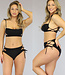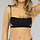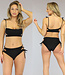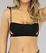 Dieses Bikinioberteil ist schwarz und hat herausnehmbare Pads. Beide Seiten sind offen und werden durch eine Schnürung zusammengehalten. Sie können die Schnürung in einen Schulterriemen verwandeln, aber Sie können das Oberteil auch einfach trägerlos tragen.