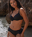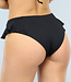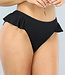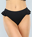 Dieses Bikini-Unterteil hat eine hohe Taille und fällt bis knapp unter den Bauchnabel. Er ist schwarz und aus einem schönen, strukturierten Stoff gefertigt. An beiden Seiten des Unterteils befinden sich Rüschen, was es besonders hübsch macht! Sie fallen schön über das Gesäß.