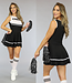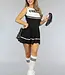 Dieses niedliche Karnevalskostüm besteht aus einem kompletten Cheerleader-Kleid mit einem Neckholder-Modell. Der Rock des Kleides ist plissiert und fällt schön weit. Auf der Brust des Kleides befindet sich der Schriftzug "Cheer". Das Kleid ist mit verschiedenen Streifen versehen. Das Outfit wird komplett mit glitzernden Pompons und hohen Sportstrümpfen geliefert!