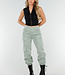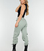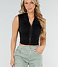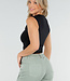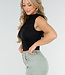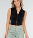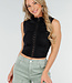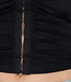 Dieses schwarze Crop-Top ist ärmellos und hat Hakenverschlüsse auf der Vorderseite. Das Oberteil besteht aus einem glatten Stretch-Stoff, der sich angenehm trägt und gut am Körper anliegt. Entlang des Verschlusses ist der Stoff leicht gerafft. Der Halsausschnitt fällt leicht nach oben und das Oberteil behält dank des Stretchmaterials seine Form.