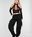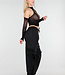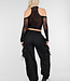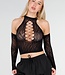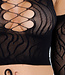 Dieses Oberteil ist aus einem dehnbaren Fischnetzstoff in Schwarz gefertigt. Das Modell hat einen hohen Ausschnitt und ein ausgeschnittenes Detail auf der Vorderseite mit durchbrochenem Muster. Die Schultern sind frei und die Ärmel sind lang und liegen eng an den Armen an. Das Oberteil hat eine verkürzte Länge und fällt eng anliegend um den Körper.