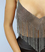 Dieses Oberteil ist absolut unverzichtbar und zieht sofort die Aufmerksamkeit auf sich. Es ist aus silbern verspiegelten Mikro-Münzen gefertigt. Das Top ist kurz geschnitten und hat Spaghetti-Träger aus Ketten. Es ist sehr einfach, das Top zu schließen, da zwei Ketten mit Karabinerverschlüssen am Rücken angebracht sind.