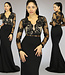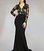 Keywords: Schwarzes Galakleid mit Schleppe, Abendkleid mit Netzoberteil, Stickerei, V-Ausschnitt, tiefer Ausschnitt, Netz, Maxikleid, langes Kleid, Metallgürtel, lange Ärmel