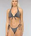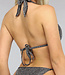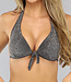 Dieses Bikinioberteil hat eine Neckholderform und wird im Nacken und am Rücken gebunden. Die Cups sind vorgeformt und haben einen eingebauten Push-up. Unter der Büste ist der Stoff in Falten gelegt. Das Oberteil ist schwarz und hat silbernen Glitter.