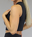 Dieses dehnbare, ärmellose Oberteil hat einen doppelten Reißverschluss auf der Vorderseite, den man sowohl von oben als auch von unten öffnen kann.