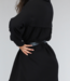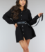 Dieses schwarze Blusenkleid hat lange Ärmel und ist mit einem Knopfverschluss versehen. Der passende schwarze Gürtel ist im Lieferumfang enthalten.
