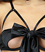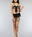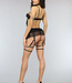 Dieses anspruchsvolle Set besteht aus einem schönen BH mit offenen Cups. An beiden Enden der Cups befindet sich ein Satinband, mit dem Sie eine schöne große Schleife auf der Brust formen können. An den Cups sind die verstellbaren Spaghettiträger befestigt. Die Rückseite des BHs hat einen Hakenverschluss, der aus zwei Haken besteht, die in drei Positionen verstellbar sind. Der mitgelieferte Tanga ist aus dem gleichen Stoff wie der BH. Über dem Tanga können Sie den plissierten Strapsrock tragen, der mit festen Strapsen ausgestattet ist. Die mitgelieferten Oberschenkelträger können Sie an diesen Strapsen befestigen. Ein weiteres Halsausschnitt-Detail ist im Set enthalten, um das Outfit besonders anspruchsvoll zu machen.