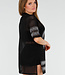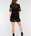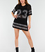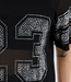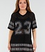 Dieses schwarze T-Shirt-Kleid ist aus vollständig transparentem Netzmaterial gefertigt und hat eine gerade, übergroße Passform. Die Vorderseite ist mit einer großen Zahl "23" in silbernen Glitzersteinen verziert. Die Ärmel und das Unterteil sind mit horizontalen Glitzerstreifen versehen. Das Kleid hat einen V-Ausschnitt, kurze Ärmel und kleine Schlitze an beiden Seiten. Die Länge reicht bis zur Mitte des Oberschenkels.