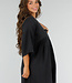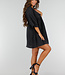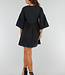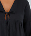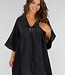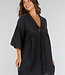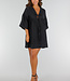 Dieses schwarze Kleid ist aus einem luftigen Baumwollmusselin mit Leinenoptik gefertigt. Das Kleid hat einen tiefen Ausschnitt und ein Schleifendetail an der Brust, das einen dezenten Akzent setzt. Die Passform ist von der Brust abwärts locker und bietet einen bequemen Look. Die Ärmel fallen bis zu den Ellenbogen und sind etwas weiter geschnitten.