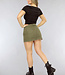 Dieses Stretch-Top ist aus einem sehr dehnbaren und weichen Stoff gefertigt. Es hat kurze Ärmel, die auf einer Seite knapp über die Schulter fallen. Der Halsausschnitt des Tops fällt drapiert und an der Seite hat es ein schönes plissiertes Detail.