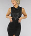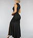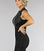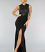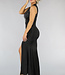 Dieses wunderschöne Galakleid ist oben mit Pailletten besetzt. Es ist ärmellos und hat einen hohen Rundhalsausschnitt mit einem Knopfverschluss. Auf der Rückseite befindet sich ein verdeckter Reißverschluss. Das Kleid hat eine schöne Passform und fällt unten weit mit Rüschen und einem langen Schlitz. Hinten ist das Kleid etwas länger als vorne.