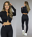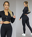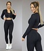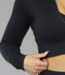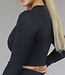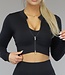 Dieses dehnbare, langärmelige Oberteil hat einen doppelten Reißverschluss auf der Vorderseite, der sowohl von oben als auch von unten geöffnet werden kann.