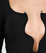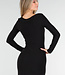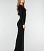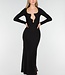 Dieses schwarze Maxikleid ist aus Stretchmaterial gefertigt und hat eine figurbetonte Passform. Das Kleid hat einen tiefen Ausschnitt mit gewelltem Rand und Metallakzenten, die für ein auffälliges Detail sorgen. Die langen Ärmel und der glatte Stoff verleihen dem Kleid einen eleganten Look.
