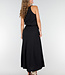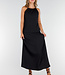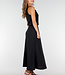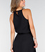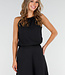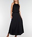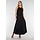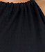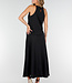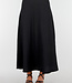 Dieses zweiteilige schwarze Set besteht aus einem Neckholder-Top und einem langen Rock aus dehnbarem Musselin-Stoff. Das Oberteil hat einen hohen Ausschnitt und wird mit einem Knopfverschluss am Hals geschlossen. Der passende Rock ist lang, leicht ausgestellt und in der Taille tailliert. Dank des dehnbaren Materials trägt sich das Set weich und bequem.