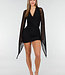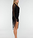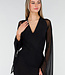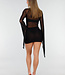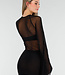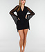 Dieses Set ist aus schwarzem Mesh-Stoff gefertigt und hat eine enganliegende Passform. Das Modell hat einen V-Ausschnitt und eine Wickelkonstruktion an der Vorderseite des Bodys. Die langen Ärmel sind aus ungefüttertem Mesh gefertigt und transparent, mit einer weit ausgestellten Form am unteren Rand. Der Rock ist kurz und reicht bis über das Knie. Der Body wird am unteren Rand mit zwei Druckknöpfen geschlossen.