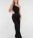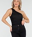 Dieser schwarze Body ist ein asymmetrisches One-Shoulder-Modell mit eleganter Drapierung auf der Vorderseite. Der Stoff besteht aus elastischem Mesh, das leicht durchscheinend ist. Die figurbetonte Passform schmiegt sich schön an den Körper an und wird unten geschlossen.