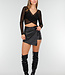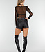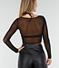 Dieses Oberteil ist in Schwarz gehalten und aus transparentem Mesh gefertigt. Das Modell hat eine überlappende Vorderseite, die einen V-Ausschnitt bildet. Der mittlere Teil ist durch den Wickel-Look teilweise offen gearbeitet. Die langen Ärmel sind vollständig aus Mesh und liegen eng an. Die Rückseite ist glatt und aus dem gleichen Mesh-Stoff gefertigt.