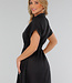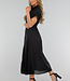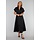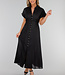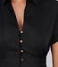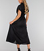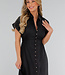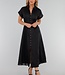 Dieses schwarze Hemdblusenkleid hat eine Midi-Länge und eine gerade Silhouette, die durch einen elastischen Einsatz an der hinteren Taille angepasst wird. Das Kleid hat einen klassischen Hemdkragen, kurze Ärmel mit festen Umschlägen und einen durchgehenden Knopfverschluss mit kleinen runden Knöpfen. Es fällt bis zur Mitte der Wade und hat einen leicht ausgestellten Rock. Der Stoff ist einfarbig und strukturiert, ohne Stickerei.