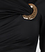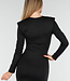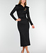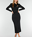 Schwarzes Midikleid mit figurbetonter Passform und glatter, einfarbiger Textur. Das Kleid hat lange Ärmel und einen einzigartigen drapierten Ausschnitt, der durch einen goldfarbenen Ring zusammengehalten wird. Die Schultern sind leicht strukturiert und mit Schulterpolstern versehen, die für eine elegante Form sorgen. Die Länge reicht bis zur Mitte der Wade und sorgt für einen stilvollen, raffinierten Look.