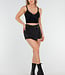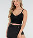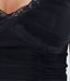 Dieses Crop-Top ist schwarz und hat einen tiefen V-Ausschnitt. Das Oberteil ist aus Mesh-Stoff gefertigt und mit Spitzendetails entlang des Ausschnitts und der Schulterträger versehen. Die Vorderseite ist mit Polstern versehen. Der Stretch-Anteil des Materials sorgt für einen angenehmen Tragekomfort. Das Oberteil ist vorne leicht gerafft. Der Schnitt ist kurz.
