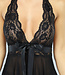 Dieses Babydoll ist aus einem weichen, durchsichtigen Netzstoff gefertigt, der mit hübschen Spitzendetails versehen ist. Es hat ein dreieckiges Neckholder-Modell, das im Nacken zu binden ist. Dadurch entsteht ein schöner offener Rücken. Unter der Büste ist es durchsichtig und hat ein hübsches Schleifendetail. Im unteren Bereich ist das Kleid in schöne Falten gelegt und fällt breiter aus.