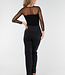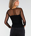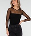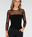 Dieses schwarze Oberteil hat ein transparentes Mesh-Oberteil und lange, taillierte Ärmel. Das Mieder ist gefüttert und verfügt über integrierte Polster, die für zusätzlichen Halt sorgen, ohne sichtbare Nähte. Das Oberteil hat einen runden Ausschnitt und eine eng anliegende Passform. Das Netzgewebe reicht bis zum Rücken und bildet einen subtilen Kontrast zum gefütterten Unterteil.