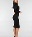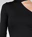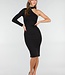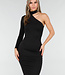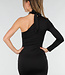 Dieses schwarze One-Shoulder-Midikleid strahlt pure Eleganz und Raffinesse aus. Der asymmetrische Ausschnitt in Kombination mit einem langen Ärmel verleiht dem Kleid einen modernen, luxuriösen Look. Die figurbetonte Passform betont die weiblichen Formen.