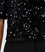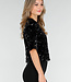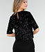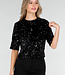 Dieses schwarze Oberteil ist vollständig mit Pailletten besetzt. Es hat kurze Ärmel, eine gerade Passform und einen Knopfverschluss am Rücken. Hergestellt aus leicht glänzendem Stoff mit gefütterter Innenseite für zusätzlichen Tragekomfort.