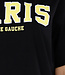 Dieses T-Shirt ist aus schwarzem Stoff gefertigt und hat eine gerade, locker sitzende Passform. Das Modell hat kurze Ärmel und einen Rundhalsausschnitt mit festem Kragen. Auf der Vorderseite befindet sich ein kontrastierender gelber Aufdruck mit dem Schriftzug „PARIS” und darunter „RIVE GAUCHE” in einer hellen Farbe. Der Stoff ist mit einem geschmeidigen Stretch versehen.