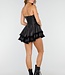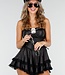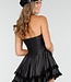 Dieses schwarze Polizeikostüm ist ein kurzes Kleid aus Lederimitat. Das Oberteil hat Cups mit Polstern und Push-up-Effekt und ist standardmäßig trägerlos. Im Lieferumfang sind transparente Träger enthalten, sodass das Kleid auch mit Schulterträgern getragen werden kann. Der obere Rand ist mit Spitzendetails verziert. Auf der Brust ist ein silberfarbenes Abzeichen angebracht, das mit einer Anstecknadel befestigt ist und daher leicht abgenommen werden kann. Das Kleid läuft weit aus in einen mehrlagigen Rock mit Spitzenrändern. An den Seiten befinden sich Schnürdetails, mit denen das Kleid geschnürt werden kann. Zu diesem Kostüm gehören eine Polizeimütze, Handschellen, eine Sonnenbrille, ein Abzeichen und transparente Träger.
