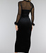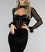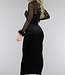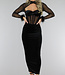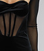 Dieses hübsche Maxikleid ist aus einem weichen Samtstoff gefertigt. Oben hat das Kleid ein hübsches Netzkorsett. Am unteren Ende der Netzärmel befinden sich süße Federn. Oberhalb der Brust befindet sich ein großer Ausschnitt. Das Kleid hat einen hohen Stretchanteil.