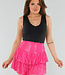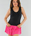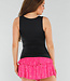 Dieses schwarze Oberteil ist ärmellos und hat einen tiefen, gefütterten V-Ausschnitt. Die Passform ist schmal geschnitten und sorgt für einen guten Sitz am Körper. Der Stoff ist glatt, dehnbar und hat ein leicht glänzendes Finish. Der Saum ist gerade geschnitten und fällt bis zur Hüfte. Die Schulterträger sind breit und verlaufen gerade über die Schultern. Der Rücken ist einfarbig.