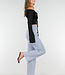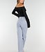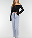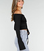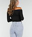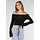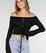 Dieses schwarze Crop-Top hat ein schulterfreies Design und lange Ärmel. Es hat einen tiefen Ausschnitt auf der Vorderseite, der mit einer dünnen Schleife verschlossen wird. In der Mitte ist es gerafft, um einen faltigen Effekt zu erzielen. Das Oberteil ist kurz und aus einem glatten, dehnbaren Material gefertigt.